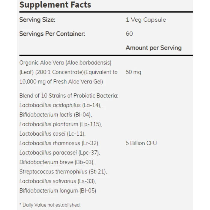 Алое вера осигурява голямо разнообразие от хранителни вещества, включително витамини, минерали, ензими и аминокиселини. Полизахаридите в растението, известни още като гликозаминогликани, се смята, че са неговите активни съставки. Научните изследвания са показали, че Алое вера може да подпомогне процесите на самолечение на организма. Комбинацията от 10-те пробиотични щама е включена в продукта за допълване действията на Алое вера в подкрепа на храносмилателната система. Една доза: 1 капсула Дози в опаковка: 30 Начин на употреба: Приемайте по 1 доза два пъти дневно Съставки: органично алое вера, Смес от 10 щама пробиотични бактерии - 5 млрд Lactobacillus acidophilus (La-14), Bifidobacterium lactis (Bl-04); Lactobacillus plantarum (Lp-115); Bifidobacterium longum (Bl-05); Lactobacillus rhamnosus (Lr-32); Strepto. thermophilus (St-21); Lactobacillus paracasei (Lpc-37); Bifidobacterium breve (Bb-03); Lactobacillus salivarius (Ls-33); Lactobacillus casei (Lc-1). Забележки: Пазете далеч от деца! Съхранявайте на сухо и хладно място! Поръчай сега от Спортен склад БГ NOW Aloe Vera 10,000mg & Probiotics / 60Vcaps. с експресна доставка!