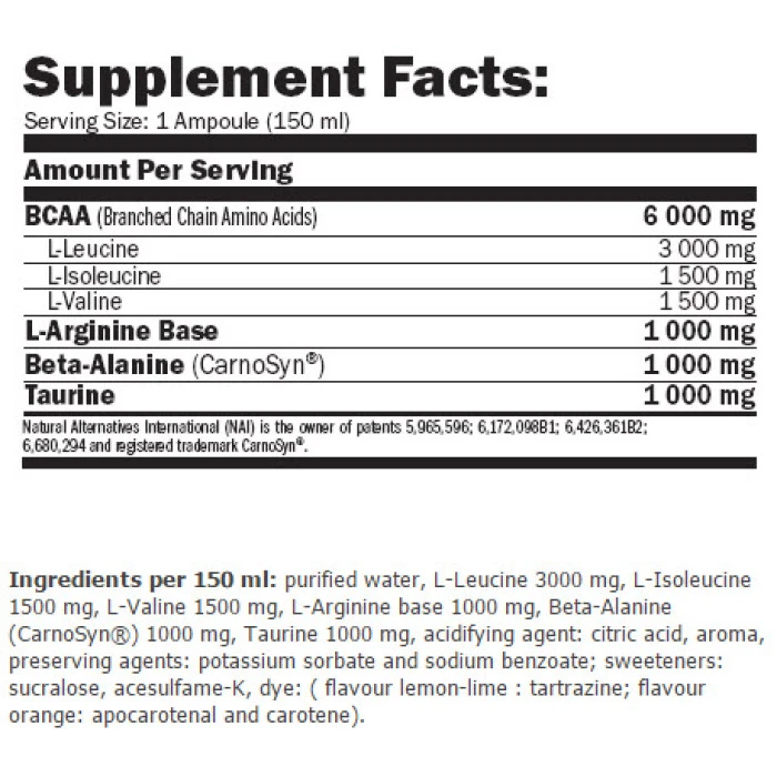 Течната форма осигурява тяхното бързо усвояване и оползотворяване от мускулната тъкан за постигане на максимален резултат. Amix BCAA MegaFuel 6000 Ви предоставя много голямо количество BCAA (6.000mg) посредством ампула с джобни размери, предназначена за „Двойна употреба” (първата половина от нея се приема преди тренировка, а втората след нея), което осигурява максимална защита на мускулните протеини от разрушаване. Аминокиселините BCAA представляват структури, изграждащи протеина, които играят ключова роля в мускулния растеж и развитие. Комбинацията от тези незаменими аминокиселини изгражда около 33% от общото количество мускулен протеин. BCAA взимат съществено участие в процеса на протеин синтеза (мускулен растеж), в повишаване нивата на енергия, за намаляване на умората, а също така имат и значителни анти-катаболни свойства. L-аргинин е аминокиселина в свободна форма, която е натоварена с няколко основни функции в тялото, включително ролята на прекурсор на азотен оксид (NO). Азотният оксид (NO) поддържа разширяването на кръвоносните съдове, като по този начин подпомага снабдяването на сърцето с адекватно количество кислород. Tази аминокиселина е необходима за увеличаване на протеин синтезата! Бета аланин (CarnoSyn) поддържа производството на карнозин в мускулите, който взима участие в процесите на регенерация на целия организъм. Тауринът представлява аминокиселина в свободна форма, която играе роля в множество метаболитни процеси. Тя е важен невротрансмитер и е свързана с количеството глюкозен прием на организма. Amix BCAA MegaFuel 6000 е подсладен с Splenda сукралоза и ето защо не съдържа аспартам! Вкусове: