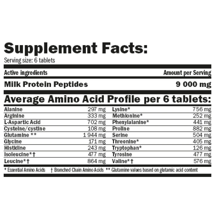 Big Milk Amino на AMIX е висококачествена формула, предназначена да осигури на организма оптимално количество чист млечен протеин. Хранителната добавка е оформена в лесни за поглъщане и разграждане таблетки. Редовният прием стимулира нарастванетона мускулната маса и доставя на мускулните клетки богат набор от аминокиселини, сред които ВСАА, и полезни хранителни вещества. Big Milk Amino на AMIX съдържа млечен протеин изолат, извлечен от пречистено и обезмаслено мляко. Суплементът има високо съдържание на казеин, който забавя разграждането и усвояването на активните съставки от организма и осигурява поетапно освобождаване на аминокиселини към мускулите. Продуктът е естествено обогатен с глутамин, който спомага за качествения синтез на протеини, поддържа оптимални нива на водород в мускулите и стимулира производството на хормон на растежа. Една доза= 6 таблетки Начин на приемане: 6 таблетки, 2-3 пъти на ден между хранения. Приемайте продукта с много вода! Дози в опаковка: 250 таблетки Вземете сега най-високо качество протеин и поръчайте Big Milk Amino на AMIX още днес! Съставки: Пептиди от млечен протеин изолат (мицеларен казеин, суроватъчен протеин), микрокристална целулоза, магнезиев стеарат Забележки: