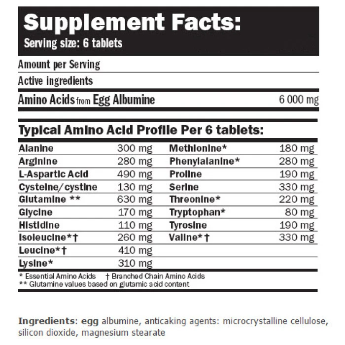 Те са предимно известни като „изграждащите структури” на мускулите, но изпълняват много разнообразни роли. Съществуват общо 20 аминокиселини, които дневно се използват от организма. Без тяхното наличие в хранителния режим, тялото ще започне да се руши. Продуктът Amix EGG Amino 6000, извлечен от яйчен протеин (албумин), представлява концентрат от първокачествени аминокиселини, свързани с пептидни връзки, богати на трите BCAA (верижно-разклонени аминокиселини). Тази хранителна добавка стимулира положителен азотен баланс и увеличава протеин синтезата. Amix Egg Amino 6000 отговаря на безкомпромисните изисквания на състезаващите се атлети и културисти, които се нуждаят от допълнително количество протеин, като основен източник на компонентите, изграждащи по-обемни и силни мускули. Една доза: 6 таблетки Дози в опаковка: 150 Начин на употреба: Приемайте 6 таблетки два или три пъти дневно между отделните хранения, придружени с голямо количество течности. За постигане на максимален ефект добавете още една доза вечер преди лягане. Съставки: ВСАА от яйчен албумин Забележки: Пазете далеч от деца! Съхранявайте на сухо и хладно място! Поръчай сега от Спортен склад БГ AMIX EGG Amino 6000 / 900 Tabs. с експресна доставка!