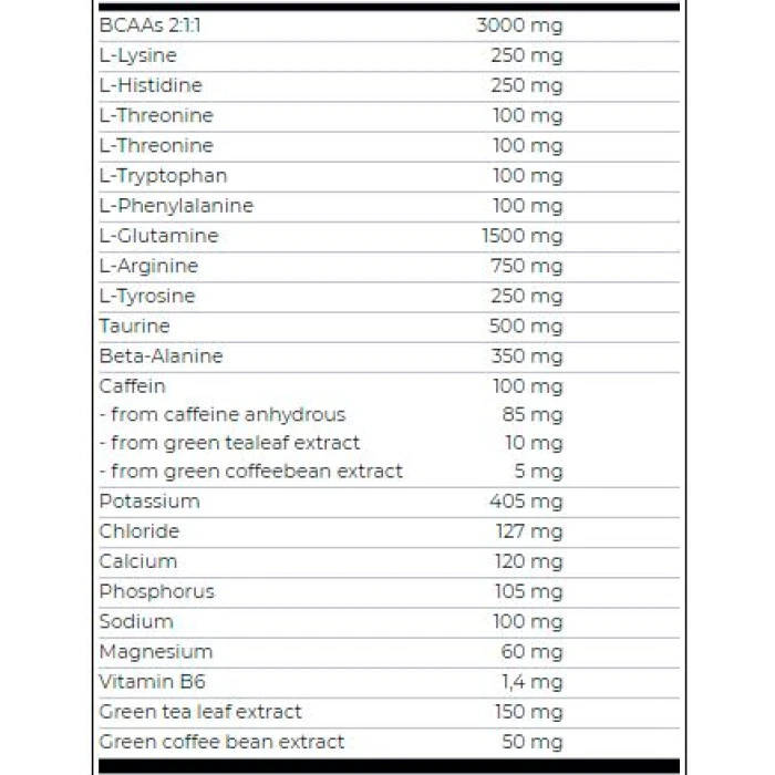 BIOTECH USA Amino Energy Zero with Electrolytes е уникална предтренировъчна матрица, която съчетава високо съдържание на аминокиселини, заедно с Бета-аланин, Л-аргинин и Л-тирозин, за максимум сила и издръжливост по време на тренировка. BIOTECH USA Amino Energy Zero with Electrolytes e с добавен кофеин и таурин във формулата си, за да повдигне енергията ти на макс и да повиши резултатите ти в залата. BIOTECH USA Amino Energy Zero with Electrolytes съдържа Витамин B6, който предпазва тялото ти от изразходването на запасите от мускулен гликоген. Магнезият регулира електролитния баланс, а синергичната комбинация между двете, подпомага метаболизма. Една Доза: 1 саше (14 грама) Начин на приемане: Смесете една доза от продукта заедно с 400мл вода, консумирайте веднъж дневно Дози в опаковка: 1 Вземи още сега с гарантирано качество от Спортен склад БГ! Съставки: Ароматизиращ агент (полидекстроза), L-левцин ( емулгатор: лецитини, малтодекстрин) 11%, L-глутамин 10.7%, киселина (лимонена киселина), L-аргинин хидрохлорид 6.5%, ароматизатори, L-изолевцин 5.4 %, L-валин 5,4%, калиева сол на ортофпсфорацид, калциева сол на лимонена киселина, таурин, натриев цитрат, бета-аланин, L-лизин хидрохлорид 2,2%, L-Хистидин хидрохлорид 2,2%, калиев хлорид, L-Тирозин 1,8% , екстракт от листа на черен чай (Camellia sinensis), зелен чай (Camellia sinensis) екстракт от листа, L-треонин0,7%, L-метионин 0,7%, L-триптофан 0,7%, L-фенилаланин 0,7%, магнезиев оксид, кофеин безводен 0,56%, подсладител (сукралоза), зелено кафе (Coffea canephora) екстракт от боб, пиридоксинехидрохлорид. Забележки: Пазете далеч от деца. Съхранявайте на сухо и хладно място. Да не се използва като заместител на разнообразното хранене. Поръчай сега от Спортен склад БГ BIOTECH USA Amino Energy Zero with Electrolytes с експресна доставка!