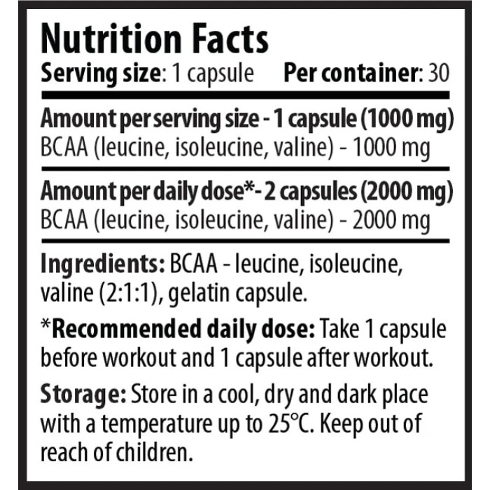Аминокиселина OLIMP BCAA Mega Caps съдържа със всяка таблетка 1100 мг л-изолевцин, л-валин и л-левци..