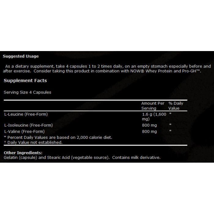 Верижно-разклонените аминокиселини на NOW Branched Chain Amino Acids са с фармацевтичен клас. Верижно-разклонените аминокиселини на NOW (BCAA) са три незаменими аминокиселини, които се съдържат в излишък в мускулите. Верижно-разклонените аминокиселини левцин, изолевцин и валин са три от осемте незаменими аминокиселини, които човешкото тяло трябва да получи от храната. Тези аминокиселини не могат да бъдат синтензирани в черния дроб. Препоръчителна употреба Като диетична добавка, взимайте 4 капсули 1-2 пъти на ден, на празен стомах, особено преди и след тренировки. Обмислете приемането на този продукт в комбинация с NOW Whey Protein и Pro-GH.