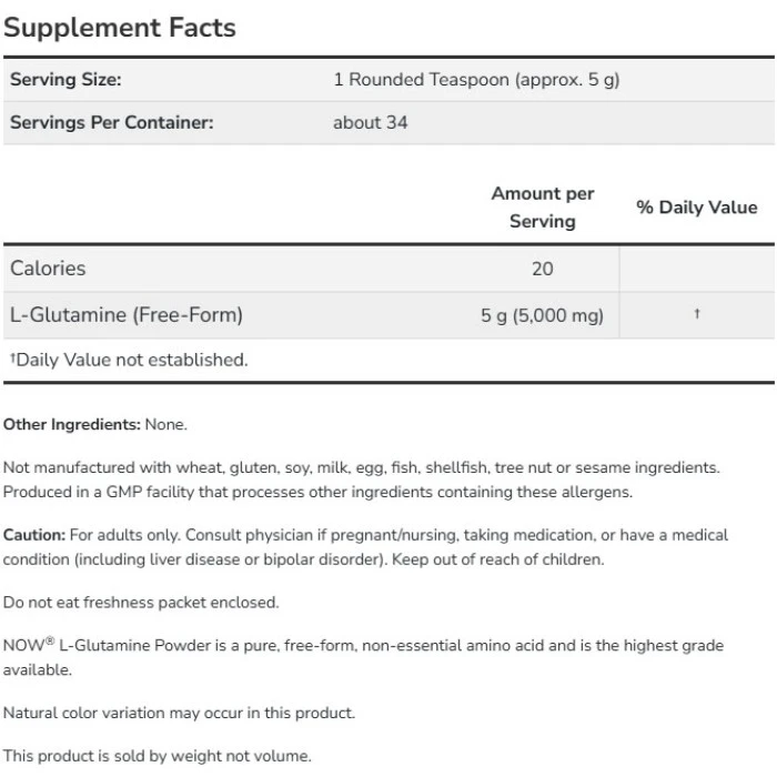 Аминокиселина NOW L-Glutamine Powder участва в поддържането на положителен азотен баланс (анаболично състояние).