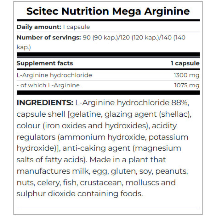 Съставки: L-аргинин HCL, магнезиев стеарат, желатин (капсули).