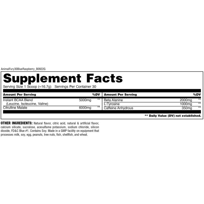 Само 5 съставки, но дозите са толкова високи, че е желателно абсолютно всеки, който реши да опита ANIMAL FURY, винаги при първият си прием да вземе само половин доза за да разбере как му повлиява и какъв е толеранса му към хранителната добавка.