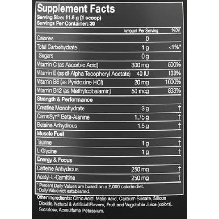 Assault Sport на Muscle Pharm е хранителна добавка от сферата на предтренировъчните продукти, и по-тясно – азотен бустер. Подходящ за всички спортисти, този продукт е създаден специално за да те накара да покажеш максимума от себе си – да бъдеш по-издръжлив в напрегнатата тренировка, да имаш повече енергия и да постигаш повече мускулна маса. Предлага се в 3 страхотни вкуса – синя малина, зелена ябълка и ягода! Една доза =1 мерителна лъжичка Начин на приемане – смесете 1 доза с вода Дози в опаковка: 30 Съставки:креатин монохидрат, Витамини: С, Е, В6 и В12, таурин, кофеин Забележки: При наличие на здравословни проблеми или ако приемате предписани медикаменти, консултирайте се с медицинско лице преди да започнете прием на продукта! Съхранявайте на сухо и хладно място! Assault Sport на Muscle Pharm те очаква сега на най-добра цена само в СИЛА БГ! Поръчай сега от Спортен склад БГ MUSCLE PHARM Assault Sport / 30 Serv. с експресна доставка!