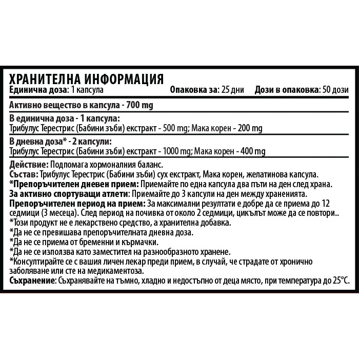 Корен от мака - перуански женшен, е източник на много биологични активни съставки, които действат синергично в подкрепа на енергията и тонуса на целия организъм. Мака е богата на желязо, цинк, магнезий, много други витамини и минерали. Мака изобилства от танини, стероли, алкалоиди, сапонини, въглехидрати, белтъчини, фибри, мастни киселини, аминокиселини и други есенциални съставки за оптимално здравословно състояние. Плодът трибулус терестрис е добре познат и още като Бабини зъби. Тази билка се използва за лечение на много здравословни проблеми, като най-използваема е билката за подобряване на либидото. Трибулус терестрис подпомага също и здравето на пикочните пътища и намалява отоците по цялото тяло. Съставката повишава нивата на тестостерон в организма и се използва свободно както от мъже, така и от жени. Една доза: 1 капсула Дози в опаковка: 25 Начин на употреба: 1 доза два пъти на ден с чаша вода, след хранене; за активно спортуващи - приемайте по 3 дози дневно, между храненията Съставки: мака - корен, екстракт от трибулус терестрис Забележки: Пазете далеч от деца! Съхранявайте на сухо и хладно място! Поръчай сега от Спортен склад БГ CVETITA HERBAL Tribulus with Maca / 50 caps. с експресна доставка!