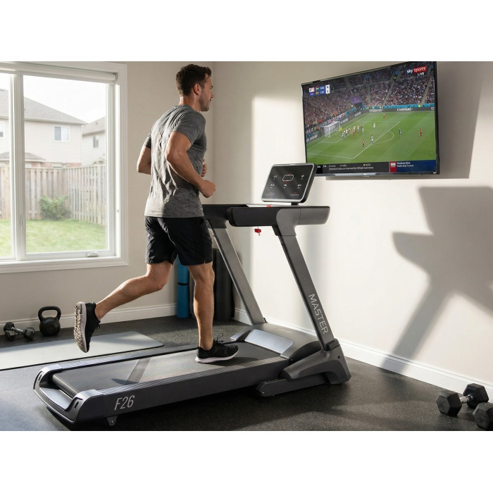 Бягащата повърхност с размери 136 × 50 см предлага комфорт и сигурност при бягане, а системата за омекотяване Shock Absorber намалява натоварването върху ставите. Ролките с машинни лагери допринасят за плавна и тиха работа. Пулс сензорите в ръкохватките, бързите бутони за скорост и наклон и многофункционалният въртящ контролер с подсветка улесняват управлението по време на тренировка. Вграденият Bluetooth високоговорител позволява да тренираш с любима музика.