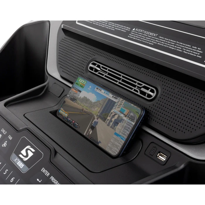 За още повече удобство пътеката разполага с вградени Bluetooth високоговорители, USB порт за зареждане, вентилатор за охлаждане, поставка за таблет и детско заключване за безопасност. Транспортните колела осигуряват лесно преместване при нужда.