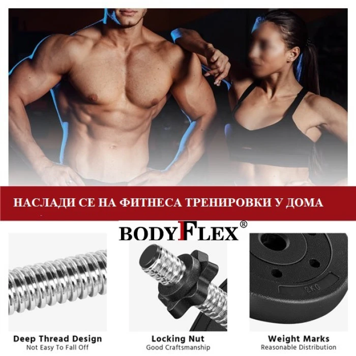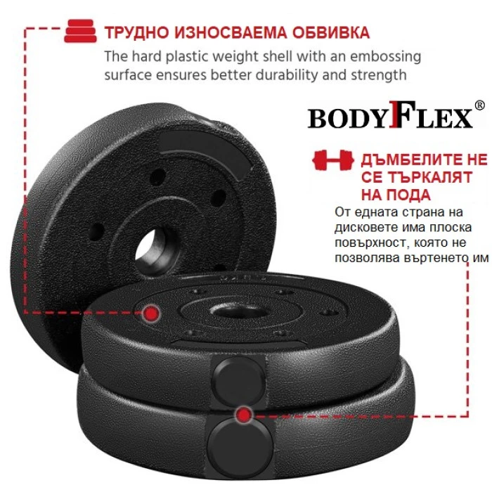Комплект 2 x 15 кг + лост за щанга. Регулируеми дъмбели Bodyflex 2 бр. x 15 кг. Общо тегло на ко..