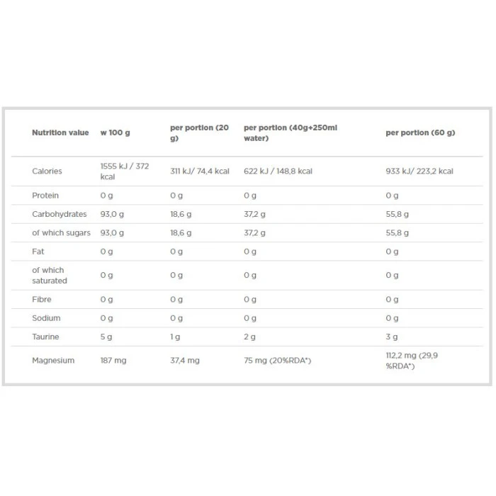 Декстрозата е най-бързо и лесноусвоимият въглехидрат, който чрез въздействието си върху нивото на инсулина в тялото съдейства за пълноценното навлизане на хранителните съставки в мускулните клетки. Добавеният таурин действа като подтиска кортизола, който е един от най-силните катаболни хормони. Освен това подобрява транспорта на креатин до мускулните клетки, съдействайки за повишен протеинов синтез. Използва се като източник на енергия и транспортна система за креатина и хранителните съставки в клетките. Най-бързият начин за възстановяване на изчерпания гликоген след тренировка и по време на състезание или физическо натоварване. Вкусове: