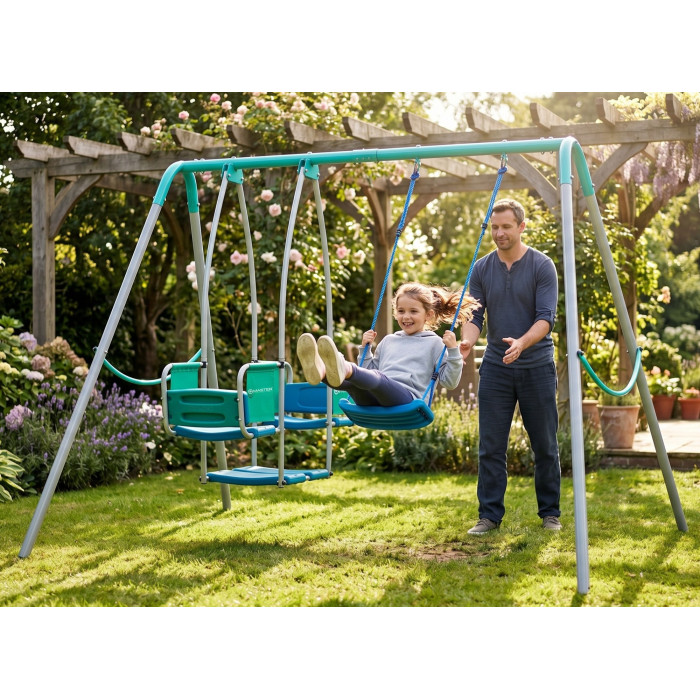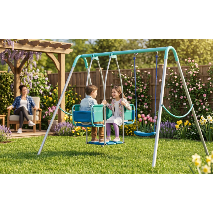 ПОВЕЧЕ МЯСТО ЗА ИГРА ЗАЕДНО MASTER A4 е детска люлка, създадена за семейства с повече от едно дете, където дворът не е само за украса, а се ползва активно. Възможността да играят до три деца едновременно е голямото ѝ предимство, защото прави модела по-практичен за братя и сестри, за гости или за по-оживени следобеди навън. Това е удобен вариант, когато търсиш градинска люлка за деца, която да носи реално ползване, а не да стои празна през по-голямата част от времето.