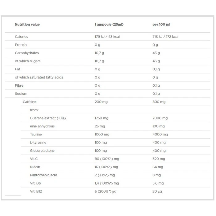 OLIMP Extreme Speed Shot 20x25ml съдържа внимателно подбрани съставки, като основната е кофеинът, съдържащ се както в чиста кристална форма, така и във вид на екстракт от гуарана. Именно кофеинът, получен от тялото от екстракта от гуарана, гарантира продължителното действие на енергията - той ще осигури усещане за енергичност в продължение на 5 часа след прилагането. Тази комбинация от различни видове кофеин дава незабавен резултат, който трае дълго - по време на целия тренировъчен процес. Но от своя страна, високите разходи за енергия са придружени от явни катаболни процеси (не само мастната тъкан, но и мускулите). За да се минимализира риска от нежелана загуба на мускулна маса, Olimp Extreme Speed Shot съдържа 1000 mg. аминокиселини таурин. Тази аминокиселина стимулира производството на серотонин, серотонинът директно забавя катаболното разграждане на телесните протеини и измества метаболизма към по-висок въглехидратен метаболизъм. Глюкуронолактонът, който също е включен във формулата, повишава способността на организма да абсорбира кислород и свързва карбоксилните киселини, които могат да бъдат използвани като енергия, ако кръвната глюкоза се изчерпи. Синергичният ефект на горепосочените компоненти се усилва от L-тирозин. Това е така нареченият вътреклетъчен „предавател“, който гарантира, че сигналите за производство на енергия ще се предават от централната нервна система до съответните органи и тъкани с максимална ефективност. От друга страна, удобната ампула осигурява много комфорт при употреба. Една доза: 1 ампула - 25 мл Начин на приемане: Препоръчва се прием 1 ампула - преди тренировка или преди физическа или умствена активност, с вода. Преди употреба разклатете добре. Дози в опаковка: 20 дози Съставки: вода, инвертен сироп, екстракт от гуарана, таурин, L-тирозин, глюкуронолактон, витамини (натриев-L-аскорбат (витамин С), никотинамид (ниацин), пиридоксин хидрохлорид (витамин В6), калциев D-пантотенат (пантотенова киселина) , цианокобаламин (витамин В12)), кофеин, регулатор на киселинността (лимонена киселина), ароматизатори, консерванти (E200, E211). В една порция се съдържат: Калории - 43 Въглехидрати - 10,7 гр., Включително захар - 10,7 гр. Кофеин (от екстракт от Гуарана) - 200 mg. Безводен кофеин - 25 mg. Таурин - 1000 mg. L-тирозин - 100 mg. Глюкуронолактон - 100 mg. Витамин С - 80 мг. Ниацин - 16 mg. Пантотенова киселина - 2 mg. Витамин В6 - 1,4 mg. Витамин В12 - 5 mcg. Забележки: Не превишавайте препоръчителната дневна доза. Не употребявайте продукта при непоносимост към някоя от съставките. Не се препоръчва да се използва от лица под 18 години, бременни и кърмещи жени или може да се употребява само по лекарско предписание. Съчетавайте с балансирана диета и упражнения. Не е известно продуктът да предизвиква странични ефекти, в случай, че се спазват указанията по препоръчителния прием. Преди употреба се консултирайте с вашия лекар. Да се съхранява на място, недостъпно за деца. Поръчай сега от Спортен склад БГ OLIMP Extreme Speed Shot Box / 20 x 25 ml с експресна доставка!