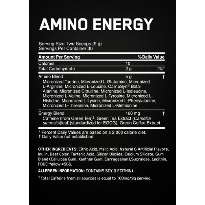 Една доза: 2 мерителни лъжички Дози в опаковка: 30 Начин на употреба: Приемайте по 1 доза дневно Съставки: амино бленда - ВСАА, таурин, глутамин, аргинин, лизин, треонин, метионин; енергийна бленда - кофеин, екстракт от зелен чай Забележки: Пазете далеч от деца! Съхранявайте на сухо и хладно място! Поръчай сега от Спортен склад БГ OPTIMUM NUTRITION Amino Energy 30 Serv. с експресна доставка!