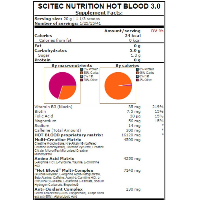 Multi-Creatine Matrix Креатиновата матрица на Hot Blood 3.0 съдържа няколко разновидности на креатина, които не само се усвояват пълноценно, но без да предизвикват стомашен дискомфорт. Креатинът е една от основните съставки на всяка сериозна предтренировъчна формула. Участва в производството на енергия и ресинтеза на АТФ, за да отложи настъпването на умората по време на тренировка. Amino Acid Matrix Аминокиселините в Hot Blood 3.0 са едни от най-важните за мускулната тъкан – аргинин, тирозин, таурин и орнитин. Те са основни за поддържане на оптимален азотен баланс по време на интензивна тренировка. "Hot Blood" Multi-Complex Тук са включени най-ефикасните форми на аминокиселини като аргинин кетоглутарат, цитрулин малат, л-карнитин тартрат и други. Освен това, матрицата съдържа и глюкозни полимери, които зареждат мускулите с гориво. Кофеинът пък е натурален стимулатор на нервната система, като повишава фокуса, концентрацията и енергията. Anti-Oxidant Complex Екстрактите от грозде и зелен чай в комбинация с ALA осигуряват нужната антиоксидантна протекция срещу свободните радикали, които се образуват по време на клетъчното дишане. По този начин