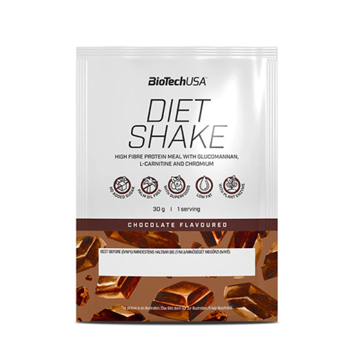 BIOTECH USA Diet Shake е изключително вкусен и полезен протеинов шейк, съдържащ цели 6 източника на диетични фибри, който подпомага изгарянето на излишни мазнини, като същевременно доставя на тялото всички необходими хранителни вещества. BIOTECH USA Diet Shake съдържа в състава си цели 6 вида диетични фибри, които регулират теглото и намаляват чувството на апетит. Освен това е обогатен с хром и калций, които регулират кръвната захар и балансират работата на метаболизма. Не на последно място, формулата на BIOTECH USA Diet Shake съдържа Л-карнитин, който стимулира изгарянето на излишните мазнини и екстракт от зелено кафе, който намалява умората и повишава енергията.