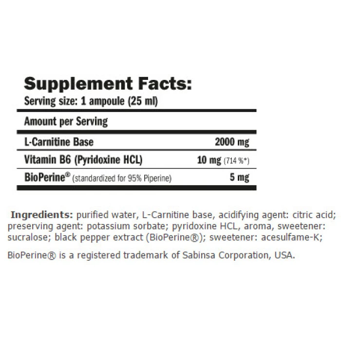 Формулата на CarniLine ® Pro Fitness от AMIX съдържа L-карнитин, който е нужен за образуването на енергия от окислението на мастните киселини. Bioperine ® е стандартизиран екстракт черен пипер и действа стимулиращо върху термогенезата, има противовъзпалителен ефект и е задължителна част от натуралните формули за отслабване. Начин на употреба: Приемайте 25 мл (1 ампула) около 20-30 минути преди тренировка.