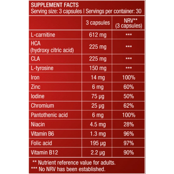Съставки: L-карнитин, L-тирозин, екстракт от гарциния камбодия, бленд Vitamine-Minerale, желатин.