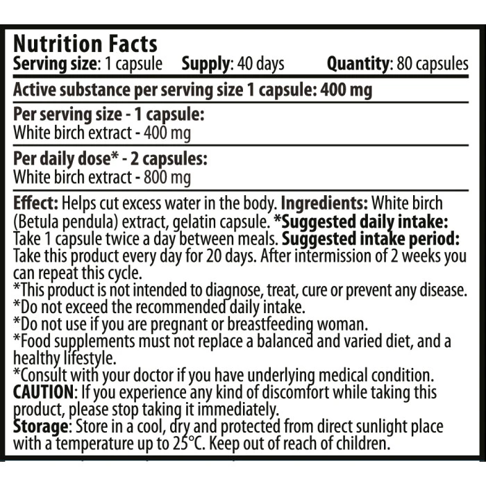 CVETITA HERBAL Water Cut / 80 Caps оказва много добър ефект при възпаления на бъбреците и влияе благотворно при различни видове отоци, тъй като помага на организма да се освободи лесно и бързо от излишните течности. Този диуретичен ефект е много ценен и в борбата с наднорменото тегло. Екстрактът от бяла бреза е също и с доказано действие и срещу атеросклероза. Спазвайте точно определения начин на прием, описан по-долу. Една доза: 2 капсули на ден Начин на приемане: Приемат се по 2 капсули на ден, разпределени между отделните хранения. За постигане на най-добри резултати се препоръчва редовен прием в продължение на 20 дни, последван от почивка около 2 седмици, след което цикълът отново се повтаря. Дози в опаковка: 80 броя, за 40-дневен прием. Съставки: Бяла бреза (Betula pendula) екстракт, желатинова капсула. 1 капсула от 400 mg съдържа Бяла бреза екстракт - 400 mg. Забележки: Не превишавайте препоръчителната дневна доза. Тази хранителна добавка не следва да замества балансираната, разнообразна диета и здравословния начин на живот. Да се съхранява на сухо място, недостъпно за деца! Поръчай сега от Спортен склад БГ CVETITA HERBAL Water Cut / 80 Caps с експресна доставка!
