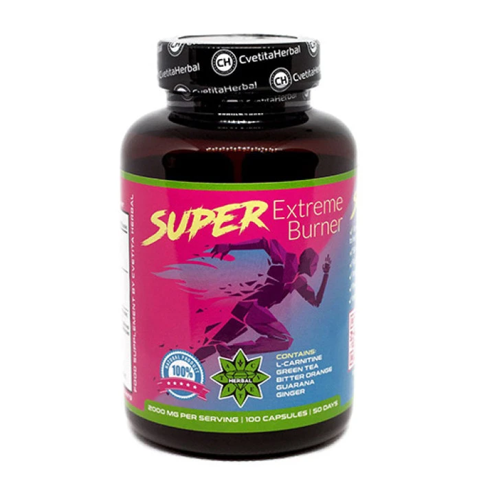 CVETITA HERBAL Super Extreme Burner 1000mg е натурална формула, която енергизира и помага за по-доброто качество на вашите тренировки. Л-карнитинът, който се съдържа в продукта, спомага за преобразуване на мазнините в енергия. Джинджифилът в CVETITA HERBAL Super Extreme Burner 1000mg има благоприятно действие за тези, които искат да се радват на хубава фигура. Той е известен още от древността и се използва като антиоксидант, помага при стомашни проблеми и стимулира отслабването. CVETITA HERBAL Super Extreme Burner 1000mg е натурално средство, което ще ви помогне да регулирате своето тегло, да се радвате на хубав силует и то здравословно. Една доза: 2 капсула Начин на приемане: Приемайте по 2 капсула дневно, сутрин след хранене Опаковка: 100 капсули Вземи сега на най-добрата цена от СИЛА БГ! Съставки: L-Карнитин тартрат, Зелен чай (Camellia sinensis) екстракт, Горчив портокал (Citrus aurantium) екстракт, Гуарана семе (Paullinia cupana) екстракт, Джинджифил корен (Z.Officinale), gelatin capsule. Забележки: Не превишавайте дневната доза! За лица над 18 години! Поръчай сега от Спортен склад БГ CVETITA HERBAL Super Extreme Burner 1000mg / 100 Caps с експресна доставка!
