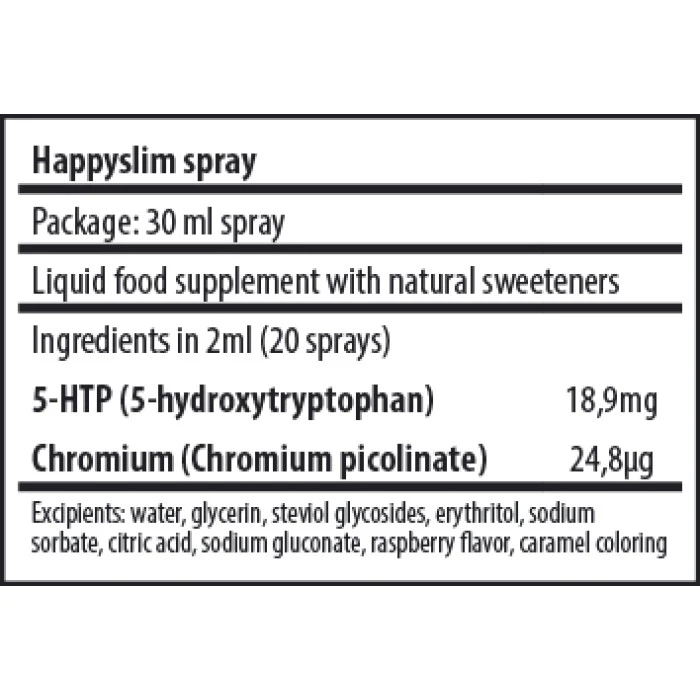 HappySlim е иновативен продукт, създаден специално, за да контролира теглото. Спреят подпомага поддържането на стройна и изваяна фигура, без да причинява стрес и да затруднява и без това претовареното ежедневие. Формулата подобрява настроението и намалява нуждата от консумиране на сладки храни.