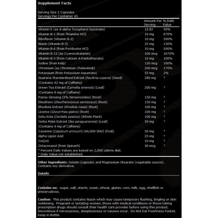 Energy 90 съдържа комбинация от растителни екстракти, витамини и други натурални съставки. Гуарана притежава добре познат термогенен ефект, който увеличава тонуса и издръжливостта, намалява умората и апетита. Зеленият чай спомага за топене на подкожните мазнини и едновременно с това оказва мощна антиоксидантна протекция на организма. Корейски жен-шен е мощен адаптоген, намалява нивата на стрес и подобрява настроението. Сибирския жен-шен увеличава издръжливостта и тонуса. Добавеният екстракт от Родиола розеа във формулата намалява стреса и повишава настроението, стимулирайки отделянето на невротрансмитери - норепинефрин, допамин и серотонин. Готу Кола е натурален извлек, който регенерира нервите и мозъчните клетки, подкрепя имунната система и подобрява работата на надбъбречните жлези. Йерба Мате e билка, която се използва като енергетик поради съдържанието на кофеин. Лют червен пипер подобрява метаболизма, изгаря мазнините и повишава енергийните нива. Добавените витамини от група B регулират работата на нервната система, участват в кръвотворенето и са важни за цялостното функциониране на организма.