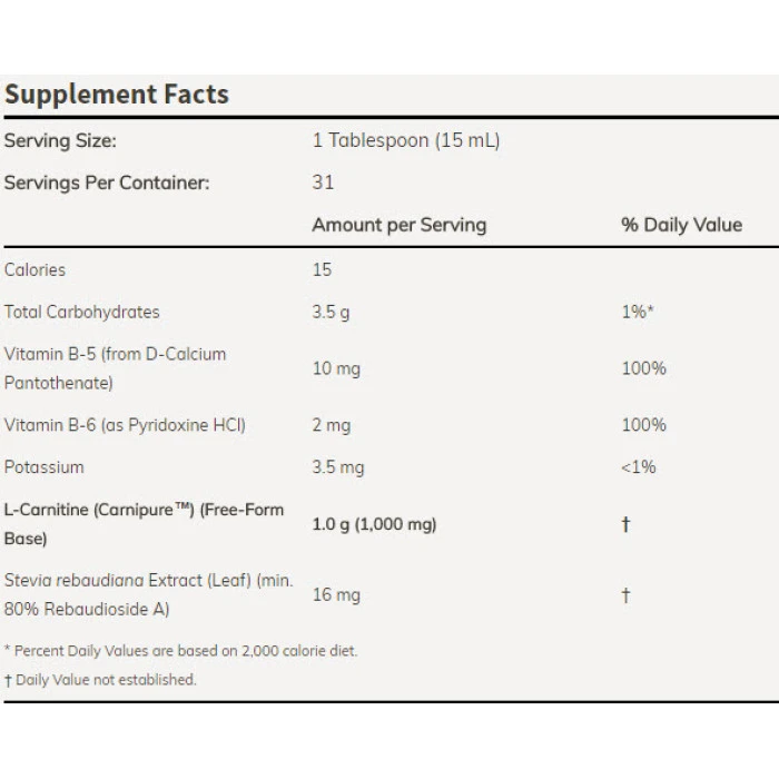 Начин на употреба: 1-2 дози (15-30 мл), 30 минути преди физическо натоварване. Съставки: Витамин В-5, Витамин В-6, калий , L-Карнитин (Carnipure ™ ), Екстракт от Stevia rebaudiana, пречистена вода, зеленчуков глицерин, ябълчена киселина, лимонена киселина, екстракти от естествени плодове и аромати, калиев сорбат и масло от лимон.