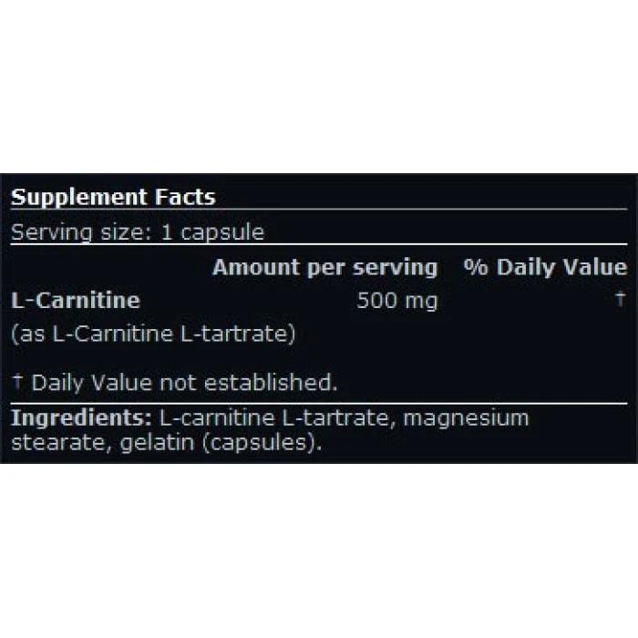 Разфасовка - 60 капсули. L-карнитин е добра и ефективна субстанция, почти като аминокиселина, играеща важна роля при горенето на мазнините и създаването на енергия в тяло ни. L-Карнитинът е важен за преносната система, която транспортира мастните киселини до митохондриите на клетките, където да се изгорят и отделят енергия. L-карнитинът дава положителен ефект върху горенето на мазнини, предпазва кръвоносните съдове от отлагане на холестерол, увеличава издържливост и възстановяването при тренировъчни сесии.