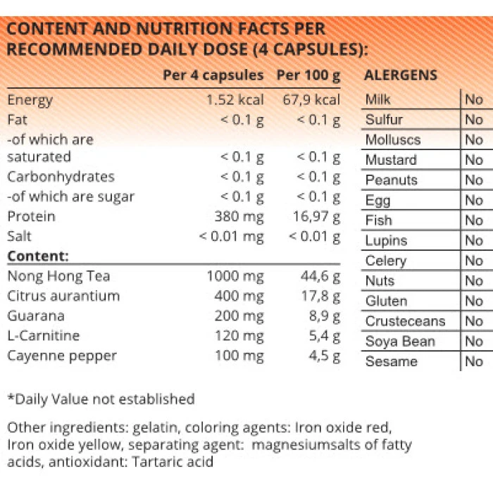 Препоръки за употреба: 2 капсули 2 пъти на ден, за предпочитане в първата половина на деня – сутрин и към обяд, с много вода. Състав: Нинг хонг чай, горчив портокал /Citrus aurantium/, гуарана, Л-карнитин, лют червен пипер, желатин, оцветители: железен оксид червен, железен оксид жълт, антислепващ агент: магнезиеви соли на мастните киселини /Е470b/, антиоксидант: винена киселина Е 334.