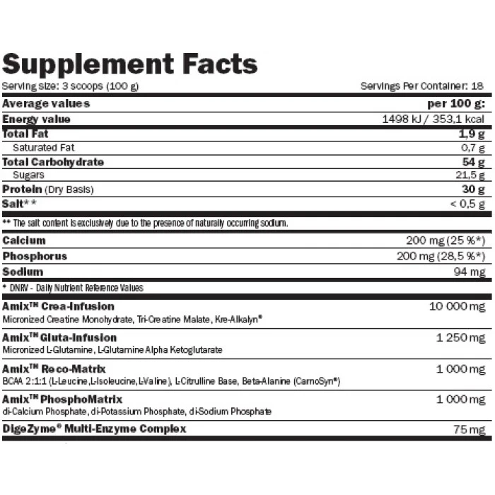 Протеиновата смес е специална комбинация от ултрафилтриран, обработен при ниска температура, суроватъчен протеин концентрат, суроватъчен протеин без мазнини и аминокиселини, извлечени от говежди протеин изолат. Въглехидратната матрица Amix CarboJet се състои от Vitargo (въглехидрат с ултра високо молекулярно тегло), Palatinose (въглехидрат с нисък гликемичен индекс и удължено освобождаване на енергия) и висококачествени малтодекстрин, фруктоза и декстроза. Amix CarboJet Mass Professinall представлява формула за покачване едновременно на маса и сила, създадена специално за състезатели по вдигане на тежести, за културисти в етап на интензивен тренировъчен процес и атлети, нуждаещи се от сила и издръжливост. Amix CarboJet Mass е изключително подходящ за активни хора, които търсят изключително висококачествена протеинова смес и въглехидратен комплекс. Калориите се доставят предимно чрез суроватъчния протеин и въглехидрати с нисък гликемичен индекс, които захранват мускулите и натрупват гликогенни енергийни депа, за сметка на мастните. Amix CarboJet Mass Professional е отличен продукт, който ще Ви помогне да изградите качествена мускулна маса, да увеличите силата и общото ниво на спортните резултати. Вкусове: