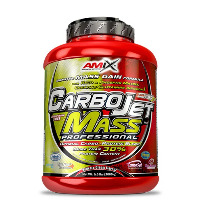 Протеиновата смес е специална комбинация от ултрафилтриран, обработен при ниска температура, суроватъчен протеин концентрат, суроватъчен протеин без мазнини и аминокиселини, извлечени от говежди протеин изолат. Въглехидратната матрица Amix CarboJet се състои от Vitargo (въглехидрат с ултра високо молекулярно тегло), Palatinose (въглехидрат с нисък гликемичен индекс и удължено освобождаване на енергия) и висококачествени малтодекстрин, фруктоза и декстроза. Amix CarboJet Mass Professinall представлява формула за покачване едновременно на маса и сила, създадена специално за състезатели по вдигане на тежести, за културисти в етап на интензивен тренировъчен процес и атлети, нуждаещи се от сила и издръжливост. Amix CarboJet Mass е изключително подходящ за активни хора, които търсят изключително висококачествена протеинова смес и въглехидратен комплекс. Калориите се доставят предимно чрез суроватъчния протеин и въглехидрати с нисък гликемичен индекс, които захранват мускулите и натрупват гликогенни енергийни депа, за сметка на мастните. Amix CarboJet Mass Professional е отличен продукт, който ще Ви помогне да изградите качествена мускулна маса, да увеличите силата и общото ниво на спортните резултати. Вкусове: