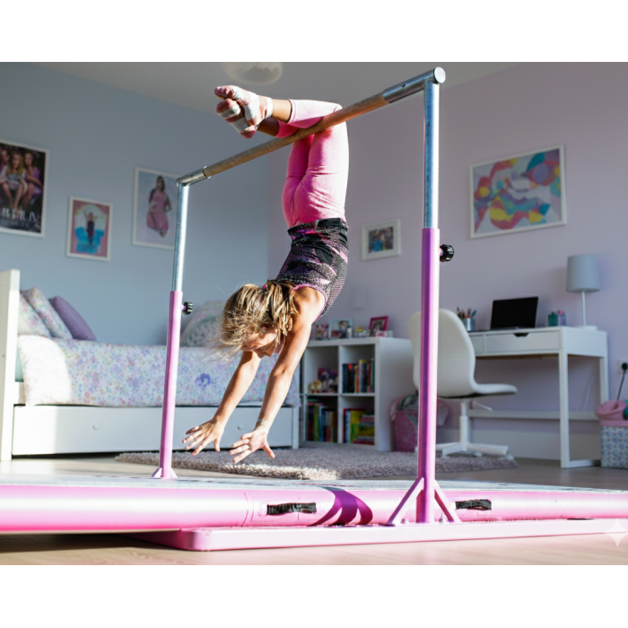 Гимнастическият лост MASTER 150 см в розов цвят е отлично тренировъчно съоръжение за деца и начинаещи гимнастици, което подпомага развитието на сила, координация и правилна техника. Подходящ е за упражнения като плъзгане, завъртане напред, назад и други основни гимнастически движения.