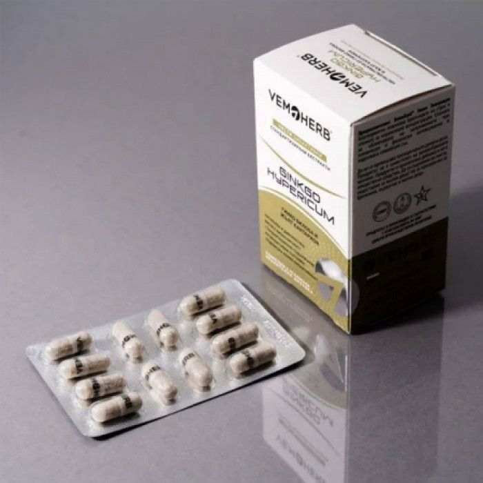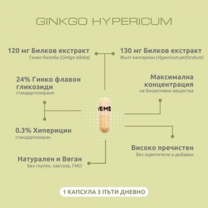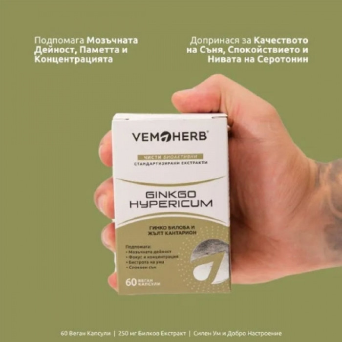 VemoHerb ® Ginkgo Hypericum включва стандартизирани сухи екстракт от листа на Ginkgo biloba (Гинко Билоба) и надземна маса на Hypericum perforatum (Жълт кантарион) с високо съдържание на активни компоненти.