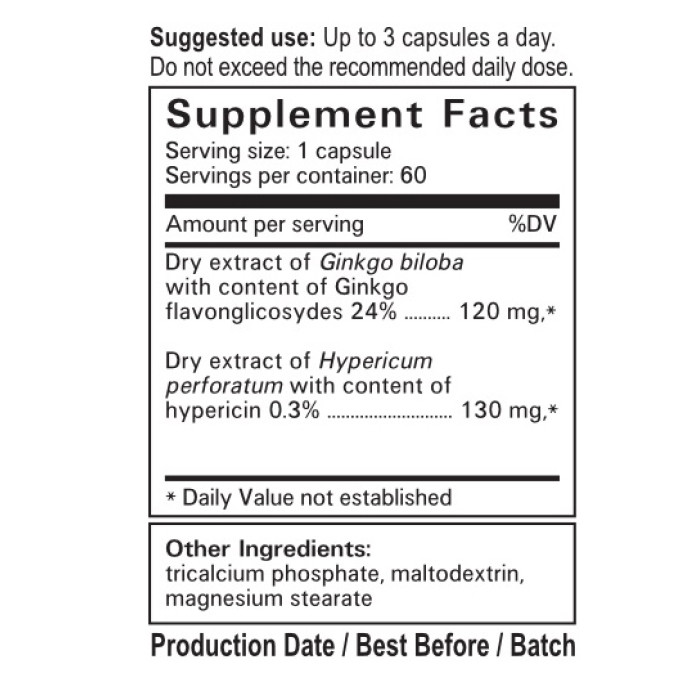 Активна субстанция в една капсула: 120,0 mg сух екстракт от листа Ginkgo biloba със съдържание на гинкго флавонгликозиди 24 %, 130,0 mg сух екстракт от надземна част Hypericum perforatum със съдържание на хиперицин 0,3 %.