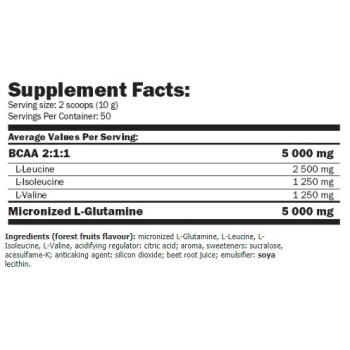 Една доза: 10 грама Начин на приемане: Вземете 1 лъжичка (5 g) приблизително 30-60 минути преди тренировка и 1 лъжичка (5 g) след тренировка. Смесете 1 лъжичка с 250-300 мл вода или сок. Дози в опаковка: 25 Съставки: Микронизиран L-глутамин, L-левцин, L-изолевцин, L-валин, противоспичащи агенти: магнезиев стеарат, силициев диоксид. Може да съдържа следи от мляко, яйца, соя, глутен, плодове и фъстъци. Забележки: Да не се превишава дневната препоръчителна доза! Да се съхранява при температура под 25 ° C на хладно и сухо място, далеч от пряка слънчева светлина. Поръчай сега от Спортен склад БГ AMIX L-Glutamine + BCAA 250g PACK с експресна доставка!