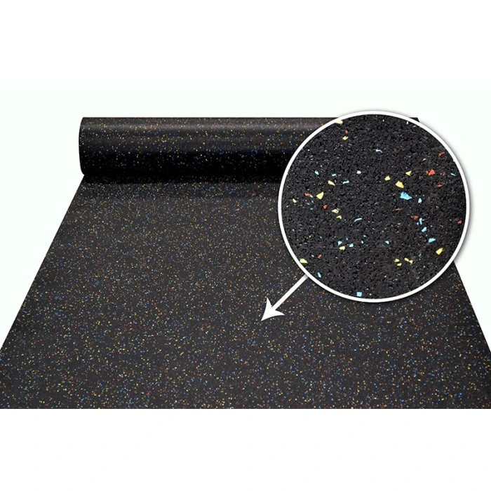 • Гумена подова настилка 125см с цветни пръски. Подходяща за поставяне на кростренажори, велоергометри, вибротренажори и др.