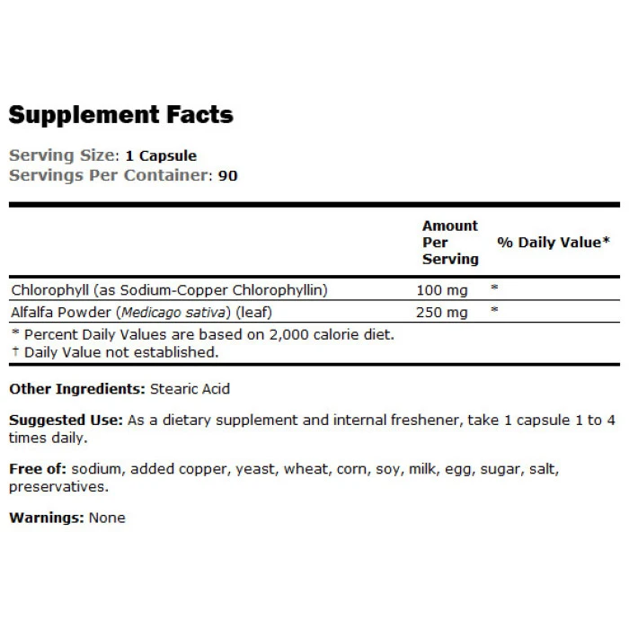Хлорофилът е уникално вещество, открито в цялото растително царство. Той представлява пигмента, придаващ зеления цвят и абсорбиращ слънчевата светлина, необходима за процеса фотосинтеза, който процес поддържа живота на растенията, посредством превръщане на слънчевата светлина в химична енергия. Определен като натриево меден хлорофилин, този разтворим във вода екстракт е извлечен изцяло от люцерна, чрез процес на естествено извличане. Начин на употреба: Под формата на хранителна добавка и вътрешен освежител, приемайте 1 капсула 1-4 пъти дневно.