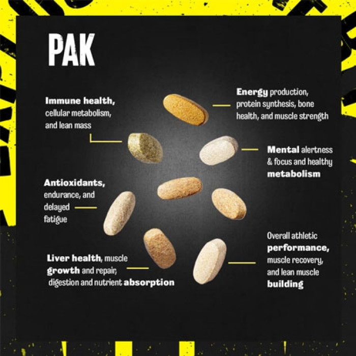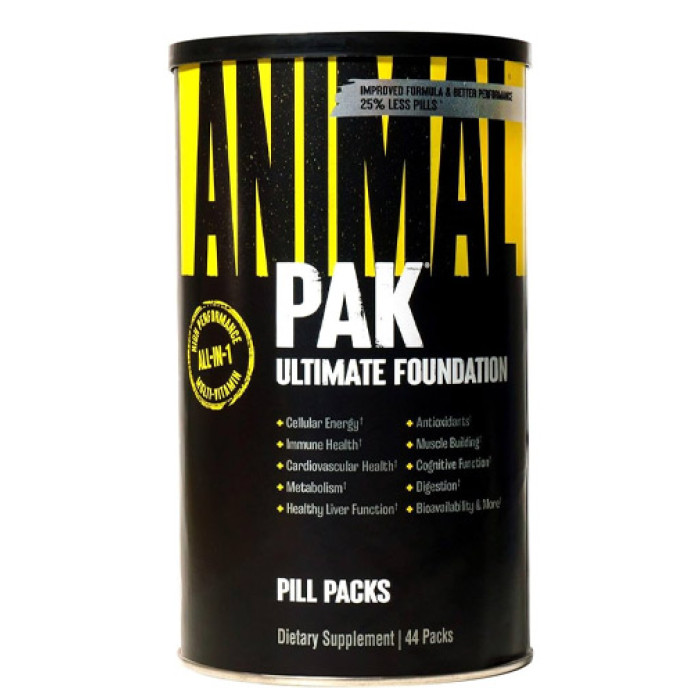 С Animal Pak от Universal Animal получавате онова, от което се нуждаете, а също така и няколко екстри. Продуктът съдържа стимулатори за по-добро въздействие, като - пиридоксин алфа-кетоглутарат (PAK), карнитин, липотропни вещества, L-аргинин, алфа липоева (тиоктова) киселина, Еleuthero и подобни. С всяка опаковка получавате обширен арсенал от над 60 ключови съставки, предоставени в точните количества и в точния момент. Всяка от единайсетте таблетки, включени в една опаковка, е създадена по специална формула за постигане на необходимите резултати. Гледайте на Animal Pak от Universal Animal, като на един коктейл от подхранваща програма, първата защитна линия на вашето тяло. В случай на тренировки с тежести, сме напълно убедени за нуждата от Animal Pak от Universal Animal. Запомнете, докато повечето продукти идват и си отиват, малко са онези, които издържат проверката на времето. Ако искате най-доброто, обърнете се към най-доверяваното име в серията от хранителни добавки за културисти:Animal Pak от Universal Animal.