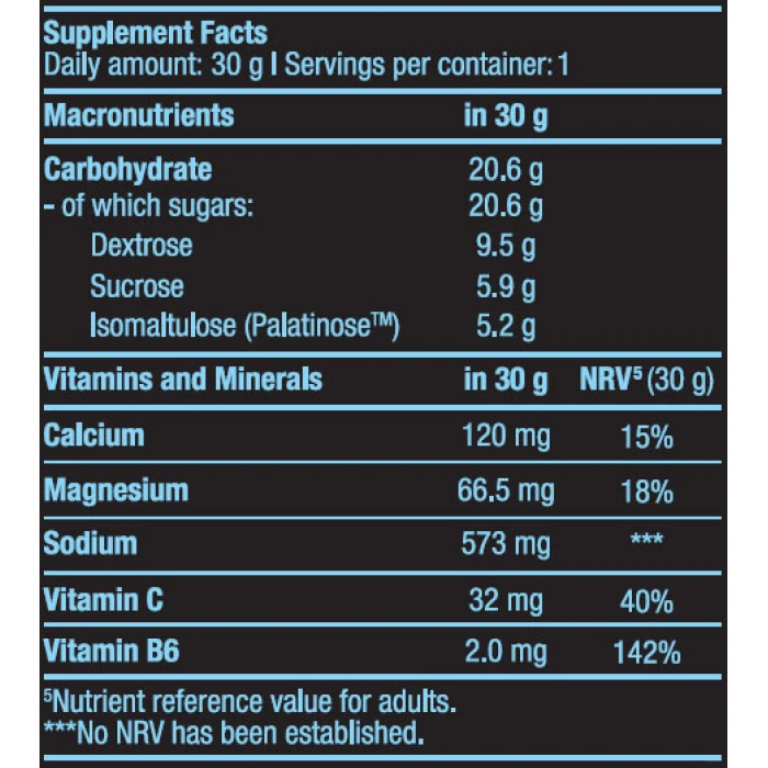 Съставки:Въглемидратна матрица [декстроза, малтодекстрин, фруктоза, палатиноза (изомалтулоза)], витаминна и минерална смес (тринатриев цитрат, монокалциев фосфат, магнезиев карбононат, трикалиев цитрат, L-аскорбинова киселина, пиридоксин НС1, тиамин мононитрат), ароматизанти, екстракт от черен чай, противослепващо средство (E341), подсладител (E955).