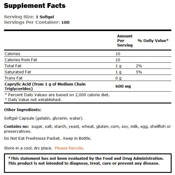 NOW Caprylic Acid е естествено получен нутриент, който обикновено се използва за поддържане на доброто чревно състояние. Caprylic Acid (Каприлова киселина) е позната още и като октаноична киселина и е късо до средно верижна мастна киселина (МСТ), която се среща естествено в кокосовия орех и в палмовото масло. NOW Caprylic Acid поддържа доброто храносмилане благодарение на своята способност да стимулира здравословния баланс на чревната флора. Препоръчителна употреба: Като диетична добавка, взимайте 1 капсула два пъти на ден с храненето. Обмислете приемането на този продукт с NOW Oregano Oil Softgels, Virgin Coconut Oil и Probiotic Defense.