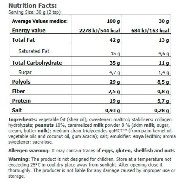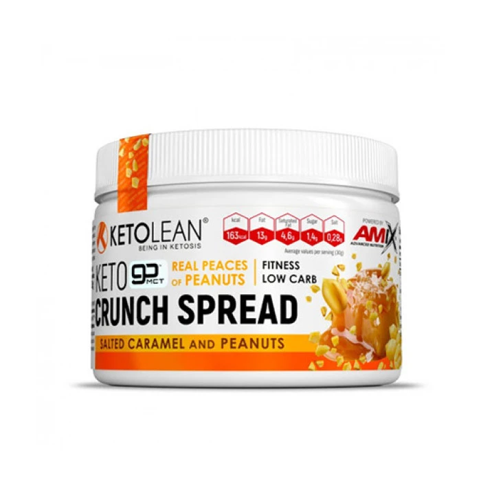 AMIX KetoLean® Keto Crunch Spread е изключително вкусен и полезен крем, пълен с парченца фъстъци, който задоволява хранителните нужди на всички атлети, които спазват кето хранителен режим. AMIX KetoLean® Keto Crunch Spread е с ниско съдържание на въглехидрати, както и високо съдържание на мазнини, което го прави перфектното решение за закуска или когато имаш нужда от нещо сладко. Една Доза: 2 супени лъжици (30грама) Начин на приемане: Смесете 2 супени лъжици от продукта, заедно с йогурт или извара Дози в опаковка: ~8 Вземи още сега с гарантирано качество от Спортен склад БГ! Съставки: растителна мазнина (масло от карите); подсладител: малтитол; стабилизатори: колагенов хидролизат; фъстъци 10%, карамелизирано мляко на прах 8% (обезмаслено мляко, захар, сметана, маслено мляко); триглицериди със средна верига goMCT ™ (от масло от палмови ядки, растителни масла и кокосово масло, акациева смола); сол; емулгатор: соев лецитин; аромат; подсладител: сукралоза Забележки: Пазете далеч от деца. Съхранявайте на сухо и хладно място. Да не се използва като заместител на разнообразното хранене. Поръчай сега от Спортен склад БГ AMIX KetoLean® Keto Crunch Spread с експресна доставка!