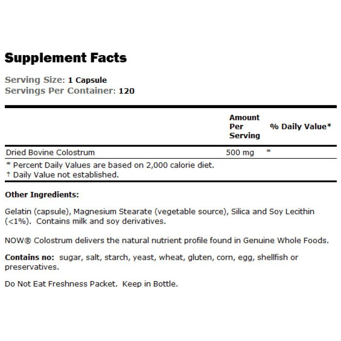 Коластра (Colostrum) е естествена хранителна съставка, която NOW Ви доставя направо от природатаи без обработка. Коластрата е подхранваща течност, която се отделя от млечните жлези на бозайници като едър рогат добитък веднага след раждането, още преди появата на млякото. Тя е изключително богата на имуноглобулини, лактоферин и множество други биологично активни протеини, които, освен че помагат за изграждането на здрава мускулна тъкан и прочистването й от подкожни мазнини, служат и за укрепване на имунната система. Множество научни изследвания доказват, че коластрата е изключително ползотворна за правилното функциониране на стомашно-чревния тракт. Освен всичко това, коластрата улеснява усвояването на хранителните вещества, като съдейства за увеличаване на техните нива на бионаличност в организма. Препоръчителна употреба на NOW Colostrum: Продуктът не е лекарствено средство. Да се приема като хранителна добавка: 1 капсула 1- 2 пъти дневно. Може да се комбинира със следните продукти на NOW: