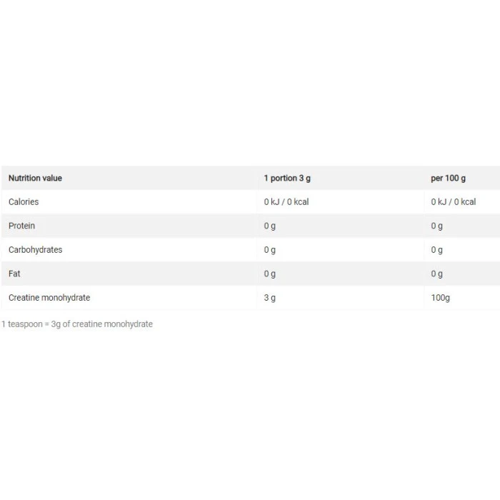 Креапюр е супермикронизирана форма на креатин, която има по-добра разтворимост и усвояемост в сравнение с традиционния креатин монохидрат. В тялото креатинът се свързва в активното съединение креатинфосфат, който при разграждането си отделя енергия за мускулно съкращение и протеинов синтез. При спортисти, практикуващи скоростно-силови дисциплини, включително бодибилдинг, с цел увеличаване на силата и чистата мускулна маса. При спортисти, практикуващи спортове за издръжливост, с цел увеличаване на енергията и издръжливостта. Една доза: 5 г = 1 мерителна лъжица Дози в опаковка: 100 Начин на употреба: 1) С фаза на зареждане - 4 дози дневно /преди закуска, между храненията, преди и след тренировка/ за 5 дни, след което - 2 дози дневно /преди и след тренировка/. 2) Без фаза на зареждане - 2 дози дневно /преди и след тренировка/. Съставки: креатин монохидрат - Creapure Забележки: Пазете далеч от деца! Съхранявайте на сухо и хладно място! Поръчай сега от Спортен склад БГ OLIMP Creapure Monohydrate Powder с експресна доставка!