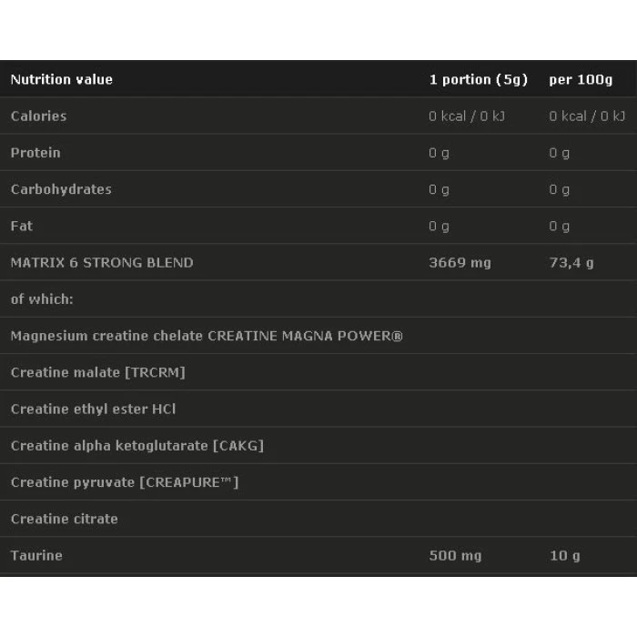 Високата биологична активност и степен на усвояване се дължи на подбраните 6 вида креатин. Организмът използва креатина като гориво за възстановяване на енергийните нива. Добавеният таурин е важен за възстановяването и намаляването на стреса при тренировки. Пълноценното разтваряне и приятен плодов вкус превръщат суплеменцията в истинско удоволствие. Осезаемо намалява времето за възстановяване след тренировка.