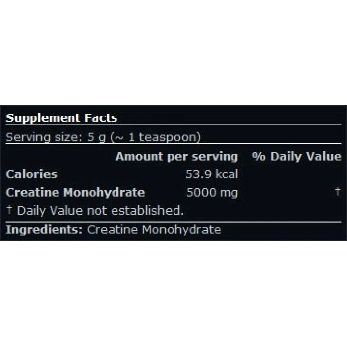 Количества: 100 g - 20 порции- 300 g. - 60 порции 500 g - 100 порции 1000 g – 200 порции Указания за употреба: Разделете телесното си тегло по килограмите на три. Това е количеството креатин в грамове, което трябва да приемате на ден във фазата на натоварване (първата седмица на приложението му). След това, за да успеете да поддържате вече постигнатото ниво, трябва да приемате половината от въпросното количество. Пийте го на празен стомах и особено след тренировки, при които сте използвали прости въглехидрати. За да разтворите по-добре, използвайте по 400ml течност на всеки 5 g креатин. По време на използването му е необходимо да приемате достатъчно количество течности Противоалергични показания: Произвежда се в съоръжение за млечни, соеви и яйчени протеини и фъстъци.