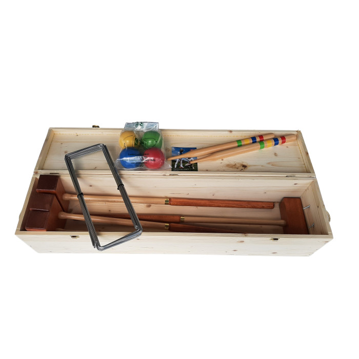 ПЪЛЕН КОМПЛЕКТ ЗА 4 ИГРАЧИ Комплектът съдържа всичко необходимо за игра на четирима – 4 стика, 4 дървени топки, 10 вратички и 2 колчета. Стиковете с дължина 100 см са удобни за игра, а дървените топки с диаметър 90 мм са ясно разграничени по цветове, което улеснява разпределянето между участниците и следенето на играта.