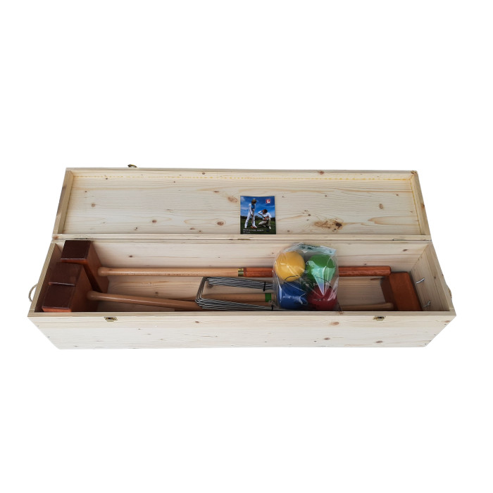 КОМПЛЕКТ С ДОБРА ОРГАНИЗАЦИЯ И УДОБНО ПОЛЗВАНЕ Стиковете с дължина 100 см дават удобен захват и позволяват комфортна игра за възрастни и по-големи деца. Дървените топки с диаметър 90 мм са ясно разграничени по цветове, което улеснява играта при пълен комплект от 6 участници. Вратичките и колчетата дават всичко необходимо, за да се подреди игралното поле и да се започне веднага.