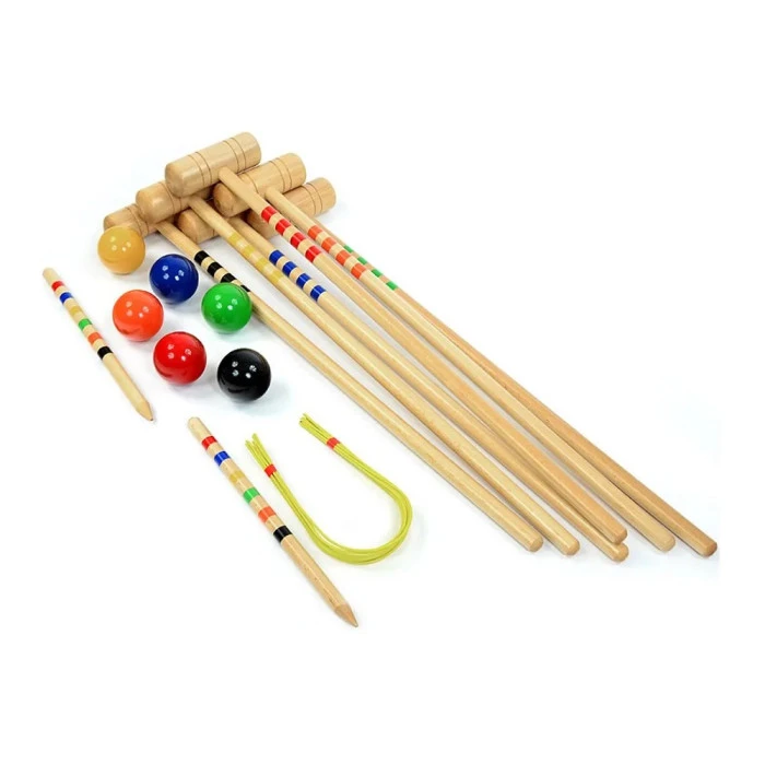 ЕСТЕСТВЕНИ МАТЕРИАЛИ С КЛАСИЧЕСКО УСЕЩАНЕ Дървените стикове, топки и колчета дават по-естествено усещане и по-класически вид на комплекта, което е търсено при този тип градински игри. Цветните топки помагат играта да е по-прегледна и по-удобна за повече участници, а вратичките оформят игралното поле по ясен и познат начин. Това е комплект, който е направен за истинска игра, а не просто за символично забавление.