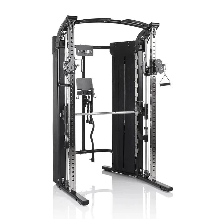 КОМБИНИРАНА СИЛОВА СТАНЦИЯ С МУЛТИПРЕСА Hammer Maximum Autark FT3 комбинира Смит машина и двойна кабелна система, което позволява разнообразни силови упражнения в една компактна тренировъчна станция. Вграденият предпазен механизъм на мултипресата позволява безопасно трениране без необходимост от тренировъчен партньор.
